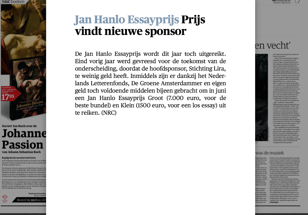 Het bestuur van de Stichting Jan Hanlo Essayprijzen maakt bekend dat de Jan Hanlo Essayprijs Groot en de Jan Hanlo Essayprijs Klein in juni 2015 zullen worden uitgereikt. De prijzen blijven dus bestaan, dit in tegenstelling tot eerdere berichten in de pers.